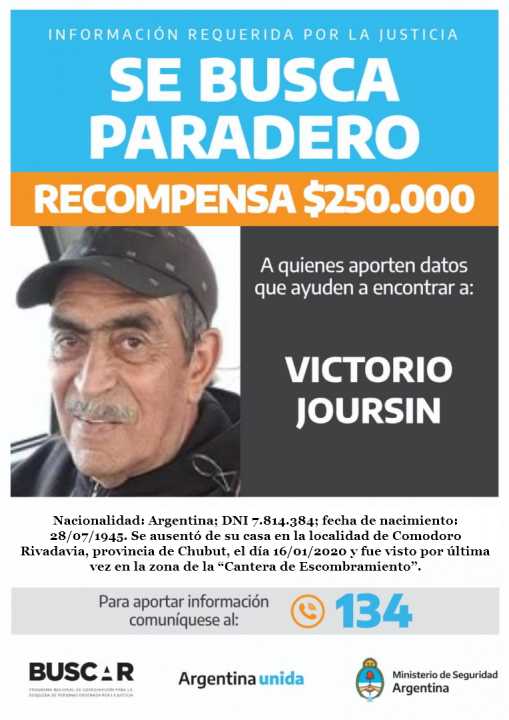 El Ministerio Público Fiscal de Comodoro Rivadavia informa que se ofrece recompensa de $250.000 a aquellas personas que, sin haber intervenido en el hecho delictual, brinden datos útiles que permitan dar con el paradero de Victorio Joursin. Éste se ausentó de su domicilio en la localidad de Comodoro Rivadavia, Chubut, el pasado 16 de enero del presente año 2020 y fue visto por última vez en la zona de la “Cantera de escombramiento”.