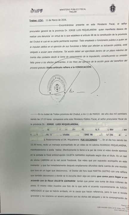 La presentación se realizó en el marco del derecho de vindicación que establece la Constitución, y tiene como objetivo que se lleve adelante una investigación completa respecto de un video que en las últimas horas comenzó a circular en redes sociales y en distintos portales informativos. El video en cuestion, se identifica como "un escandalo que sacude a la justicia de Chubut" dicha filmacion muestra a una persona de sexo femenino pagando para acordar una condena. A partir de esta presentación, el Ministerio Público Fiscal iniciará las actuaciones correspondientes con el fin de analizar el contenido del material difundido y determinar las circunstancias del hecho, conforme a los procedimientos previstos por la ley.